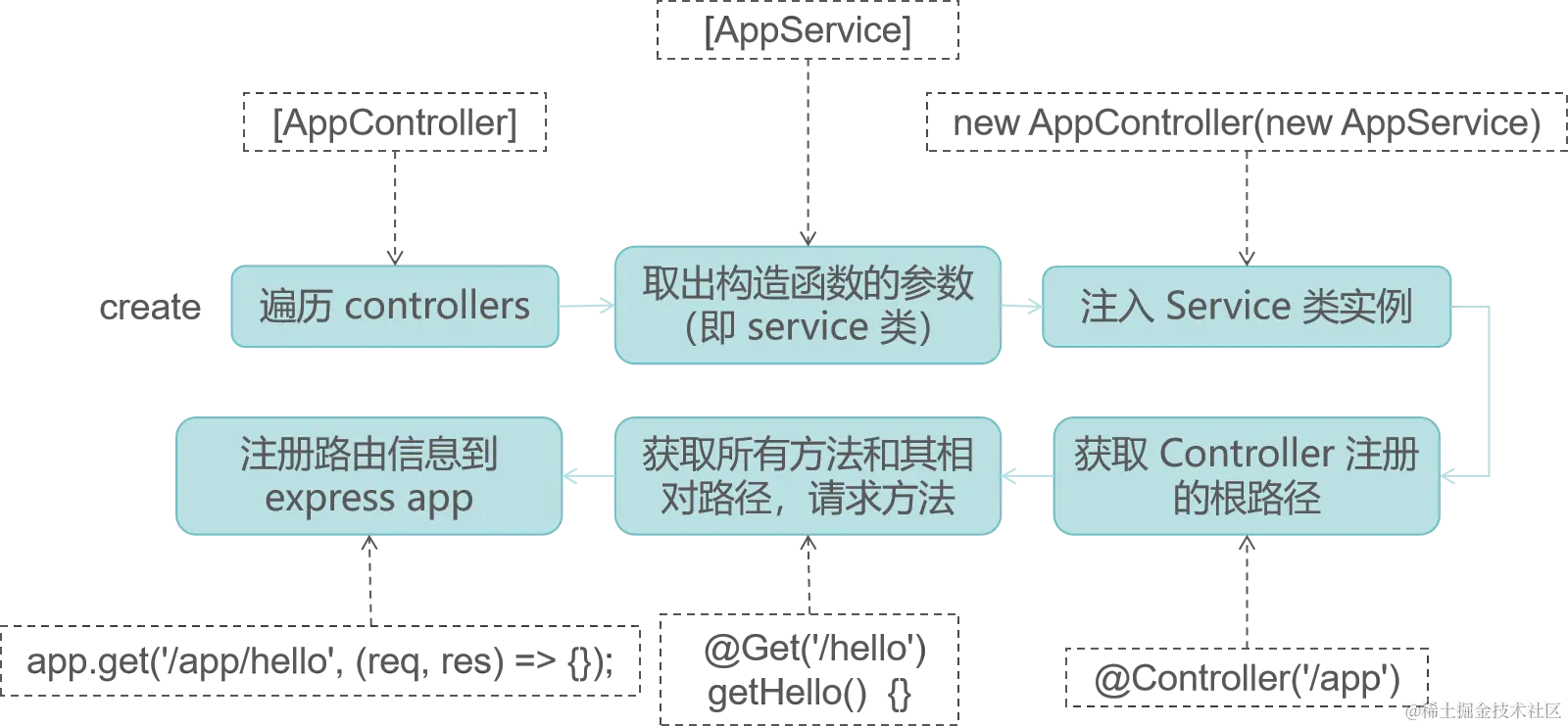 之前我们存的元数据信息里,有标记为需要被注入的类的信息(布尔值)、请求的路径信息和请求方法,我们在 create 方法中要做的事由一张图说明就是: