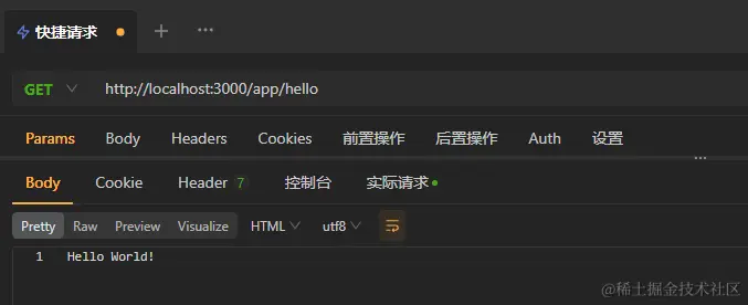 使用 ts-node 执行该文件后,服务被启动,使用 Apifox 请求 http://localhost:3000/hello 会看到返回了 Hello World!,这就是最基本的用法。