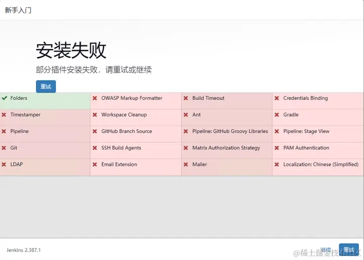 插件安装界面,如果失败没有关系,是因为镜像源的问题,后面更改就好了,点击继续