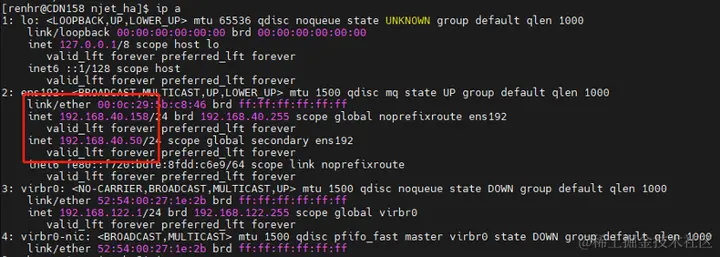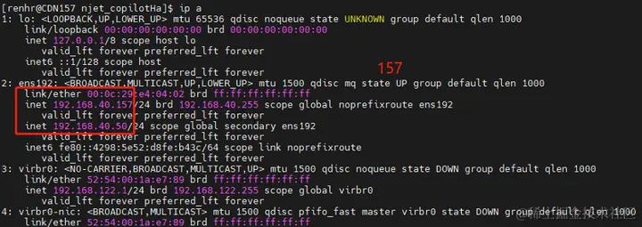 三台服务器上的NJet都启动时,由于40.157是MASTER,该主机将获取到VIP: