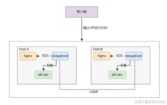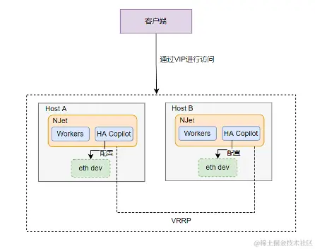 为了简化部署及配置,NJet 通过Copilot 扩展机制实现了VRRP协议的HA模块,只要加载HA Copilot 并提供相应的配置文件,即可实现高可用功能,示意图如下: