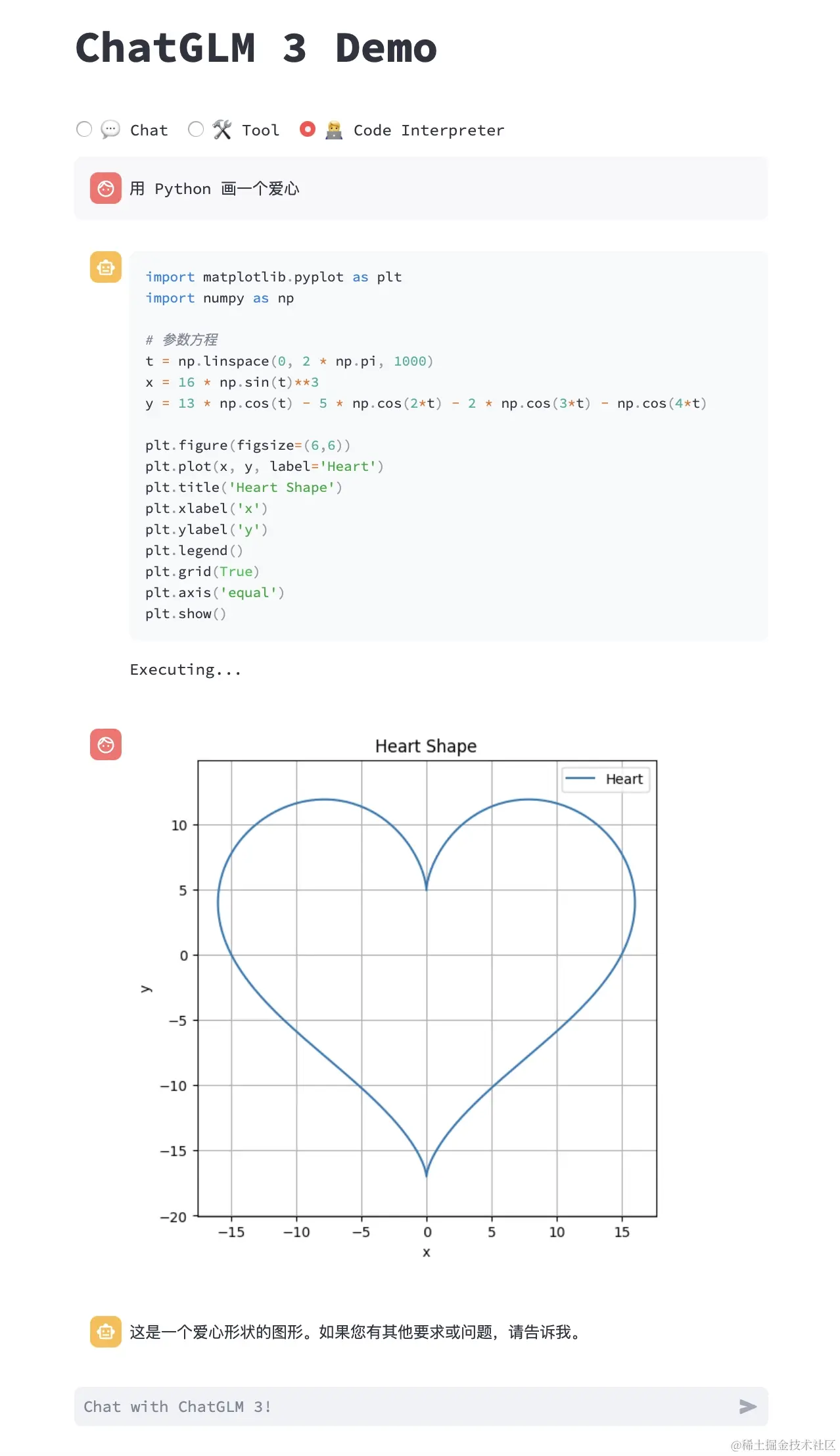 例如,我们可以让 ChatGLM3 画一个爱心: