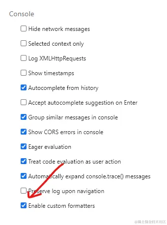 为了解决这个问题我们要用到浏览器的Enable Custom Formatters的设置,Enable Custom Formatters是一个功能强大的选项,允许开发者自定义在Devtools中展示的数据格式。开启后的效果