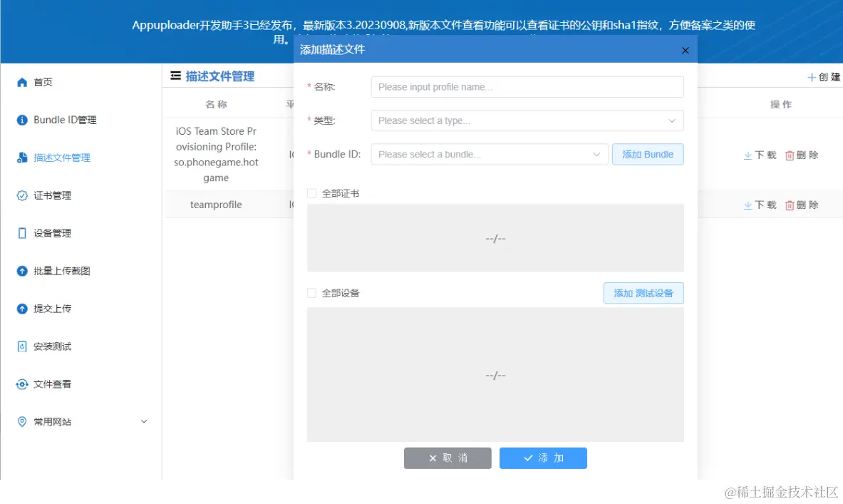 最后我们还需要获取描述文件描述文件 (mobileprovision) ,点击+新建,注意此时也要选择Development下的IOS App Development选项,点击下一步,选择我们提前创建的bundle id点击继续,选择我们刚刚创建好的证书文件,再次点击继续,选择需要参与调试的设备,即我们刚才添加的设备,点击继续,输入描述文件名称后即可生成并进行下载。