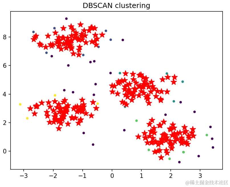 然后就可以用fit方法来训练模型,使用fit_predict方法来对数据进行预测,用labels_属性来获取每个点的簇标签,用core_sample_indices_属性来获取核心点的索引。代码如下: