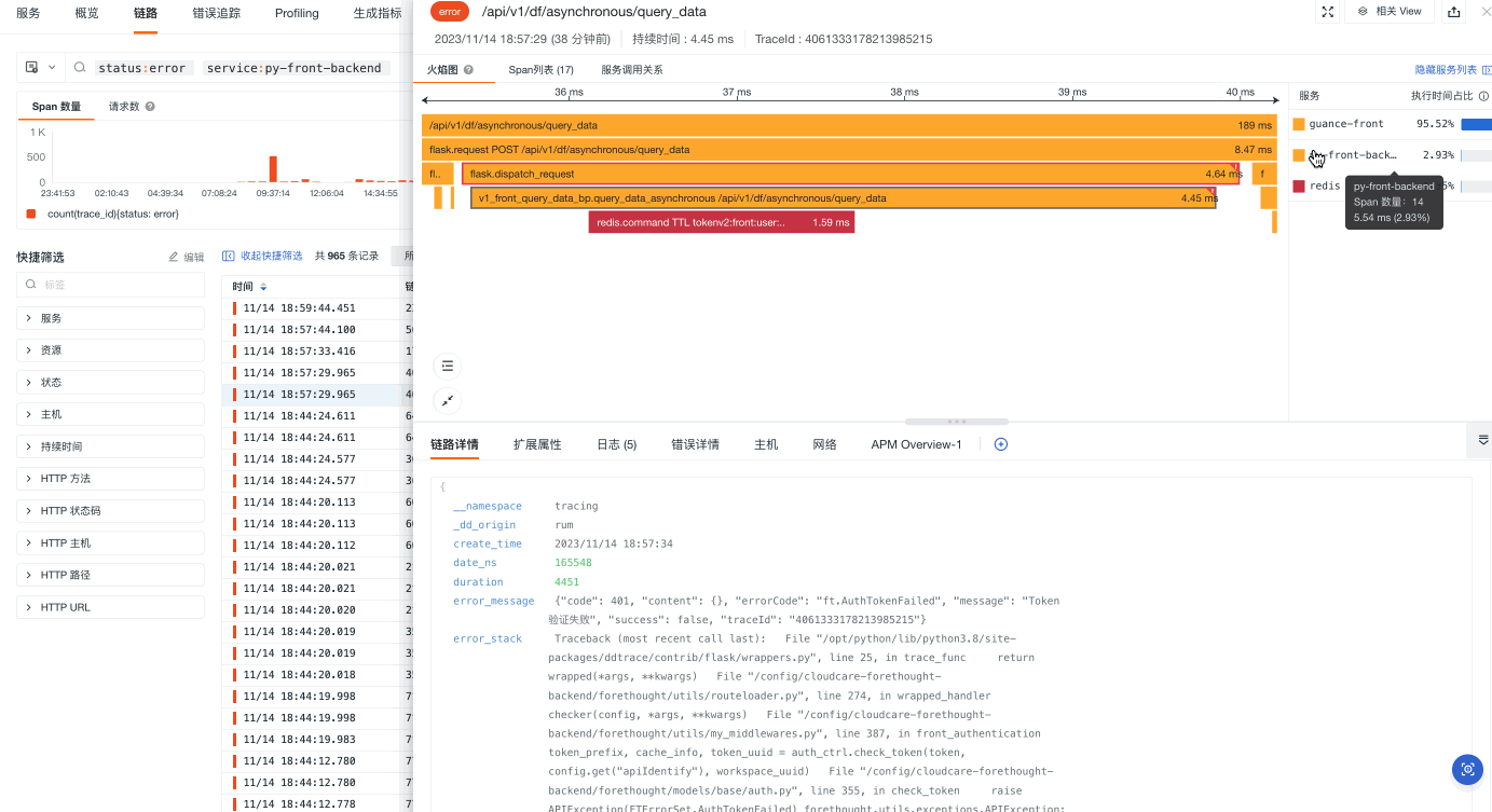 下图是一条链路异常调用的火焰图。我们可以看到在 guance-front 这条父 Span 下存在两条 status:error 的 子 Span。分别点击这两条 Span,我们可以从 error_message 看到出现错误均是由于 Token 验证失败 引起。由此我们就可以采取针对性的优化措施。