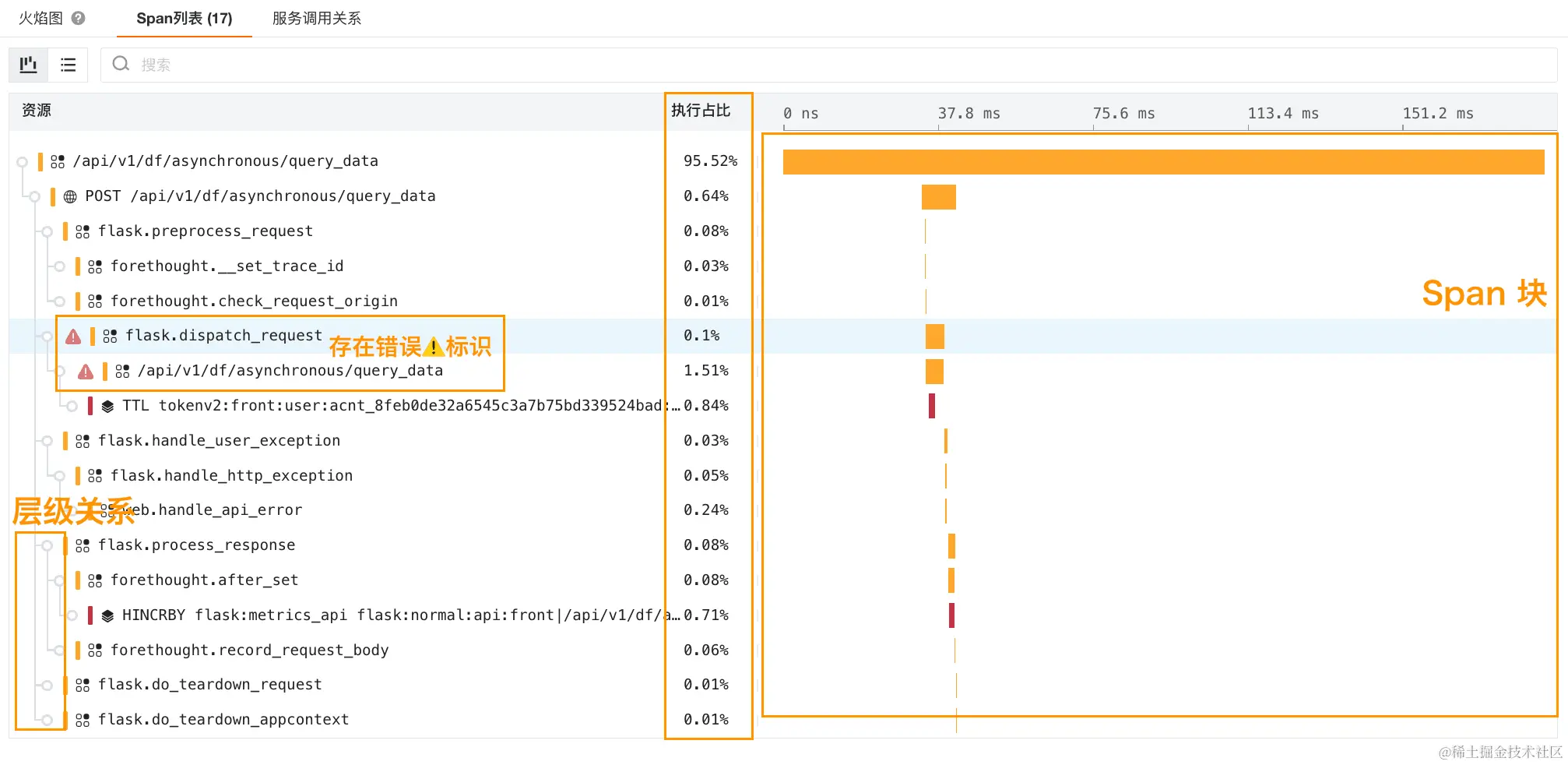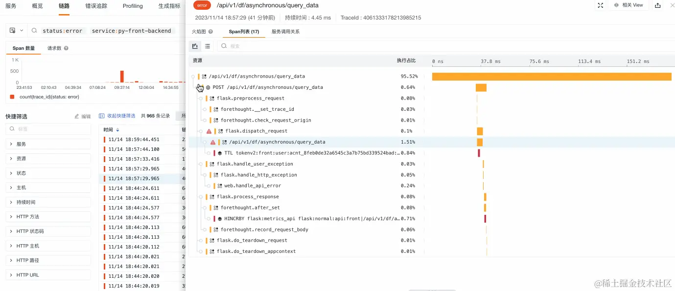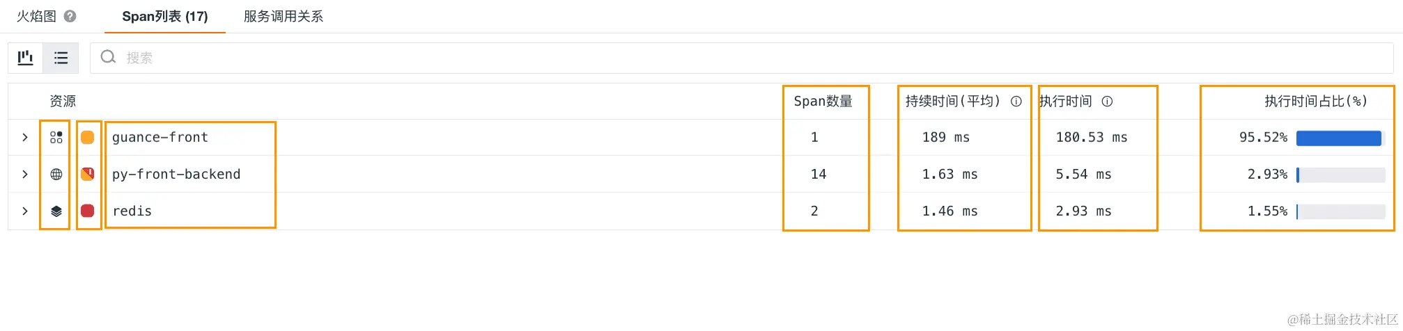 status = error的 Span、服务名称、当前服务下面的 Span 数量、Span 持续时间(duration)的平均值、执行时间总和以及执行时间占比;