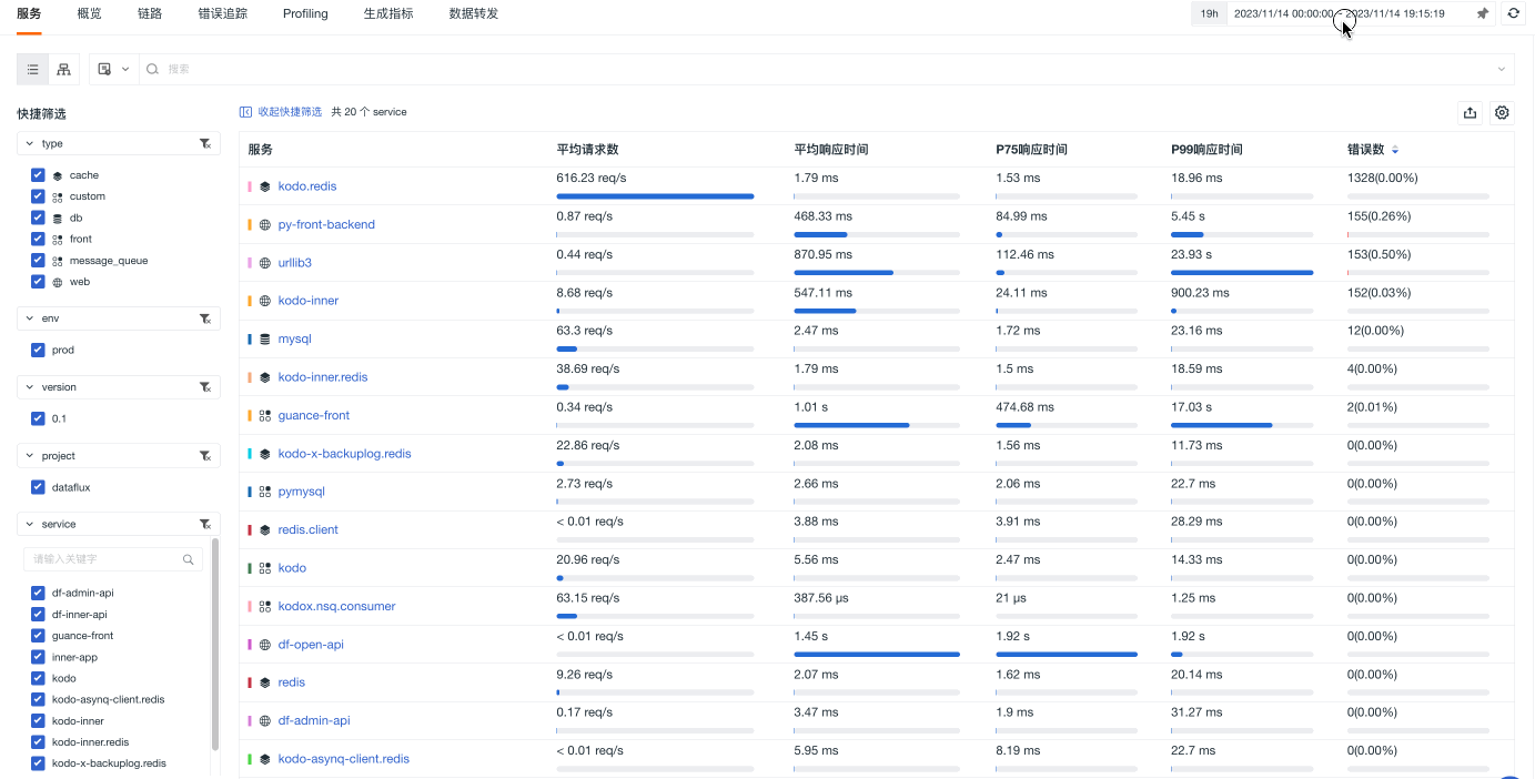 假设我们需要排查昨日服务产生的错误数。在应用性能监测 > 服务列表,可以看到 kodo.redis 这条服务产生的错误数最多。点击右侧 搜索 图标,直接前往链路查看器查看错误详细信息。