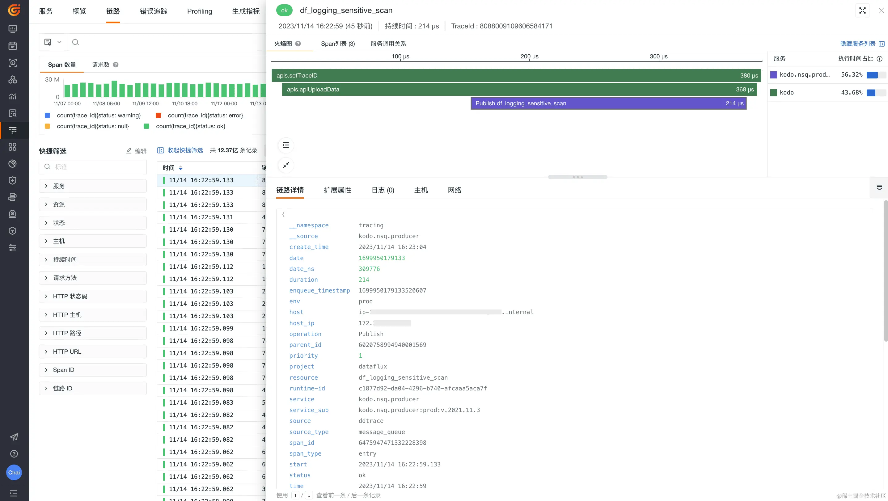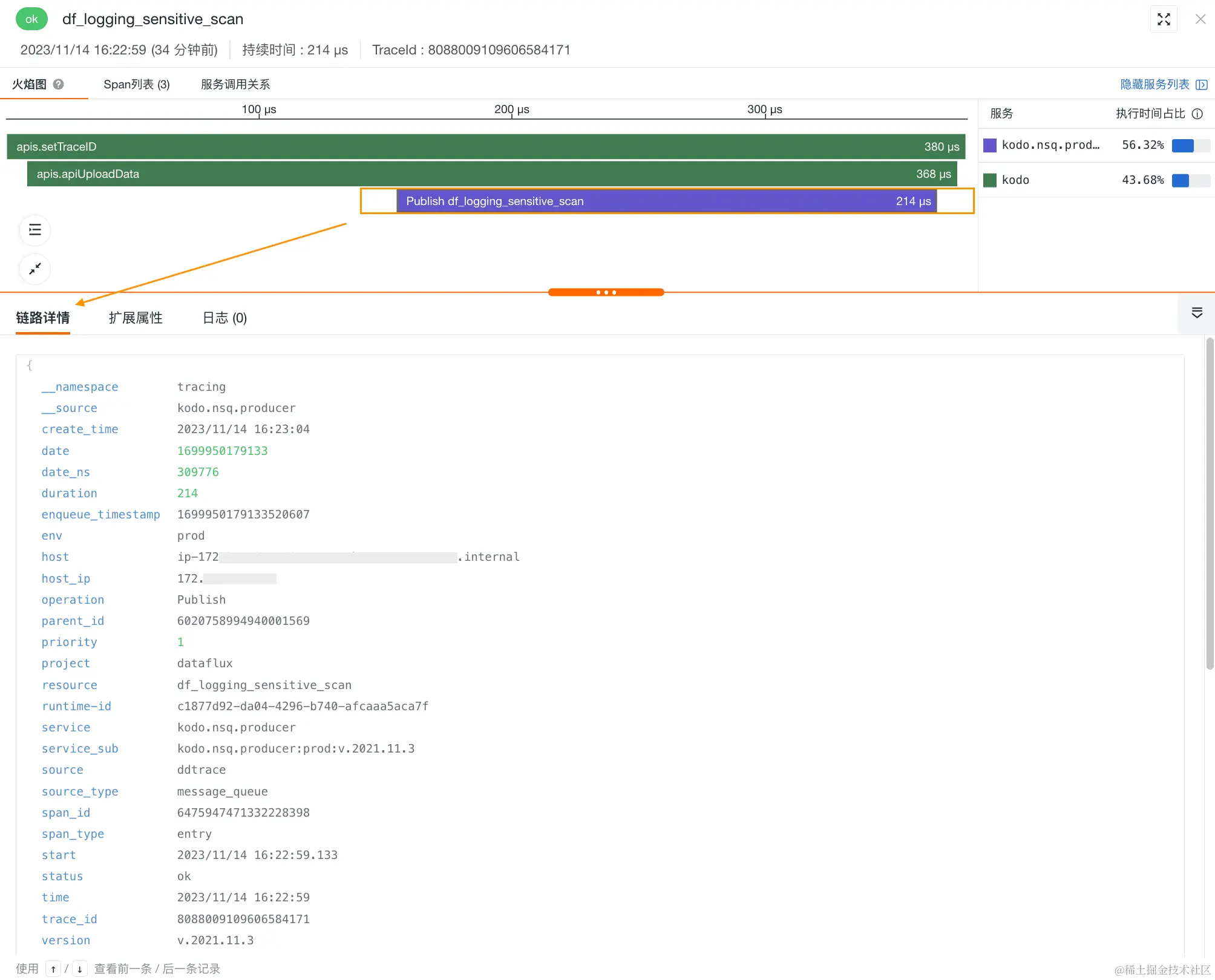 当我们点击某条 Span,如 kodo.nsq.producer。默认显示当前 Span 的资源(resource)或操作(operation)、持续时间(duration)以及是否存在错误(status = error)。在下图的提示中,我们可以简单得知该条 Span 的 resource 、operation 和 duration。