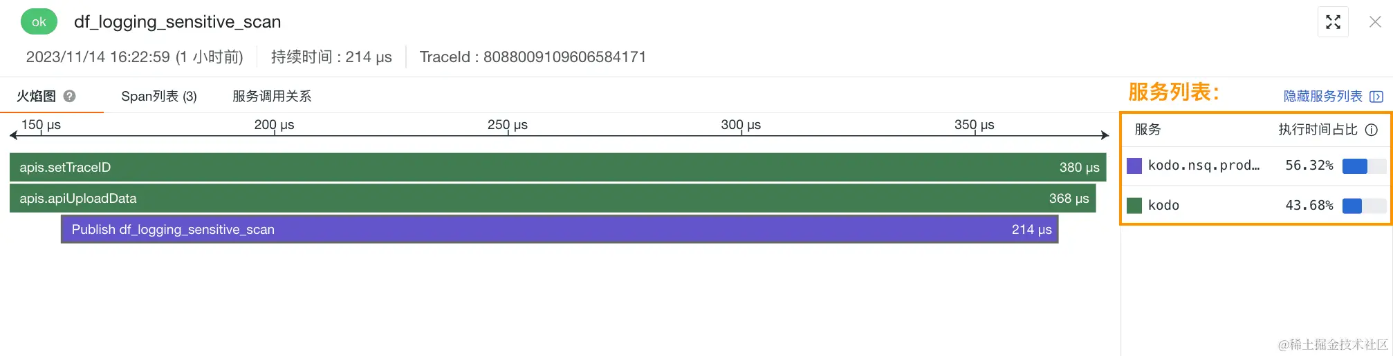 在火焰图右侧的服务列表,显示当前 Trace 内发生请求调用的服务名称、对应颜色及该服务执行占总执行时间的比率。