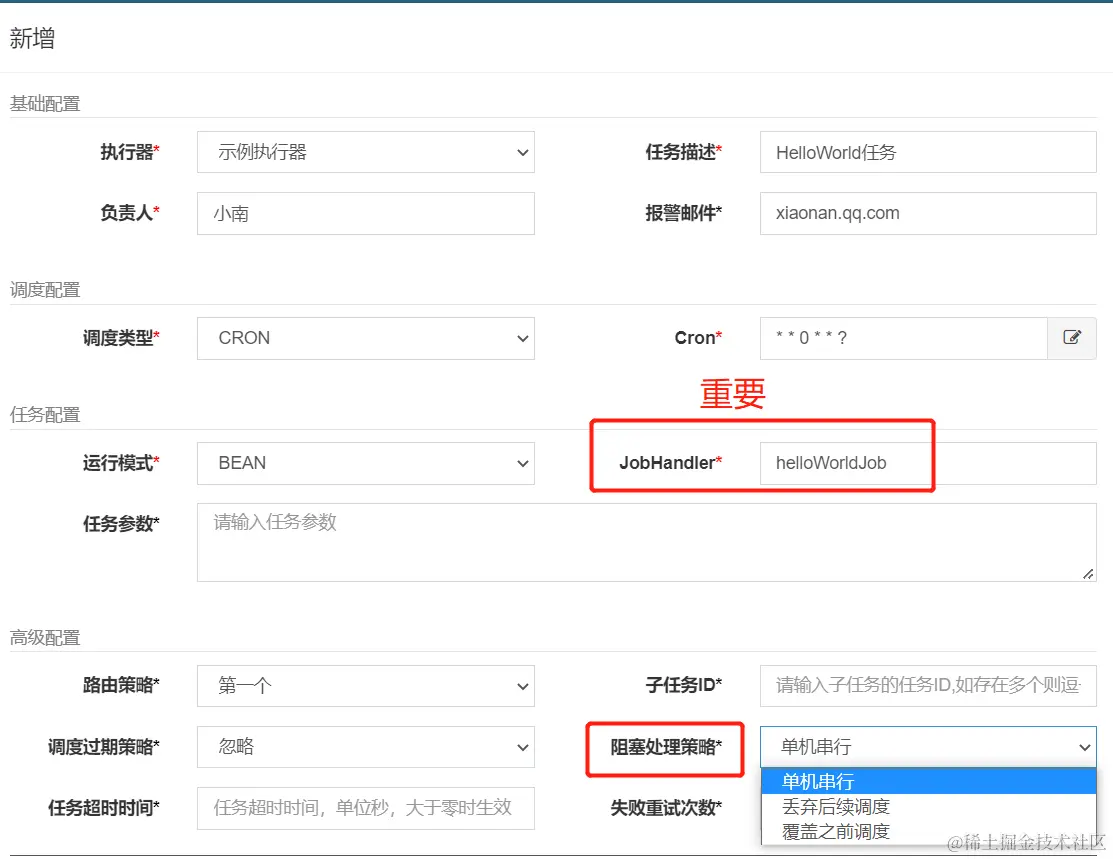 JobHandler:这个名词要记牢 要与程序中的@XxlJob注解的名称保持一致。