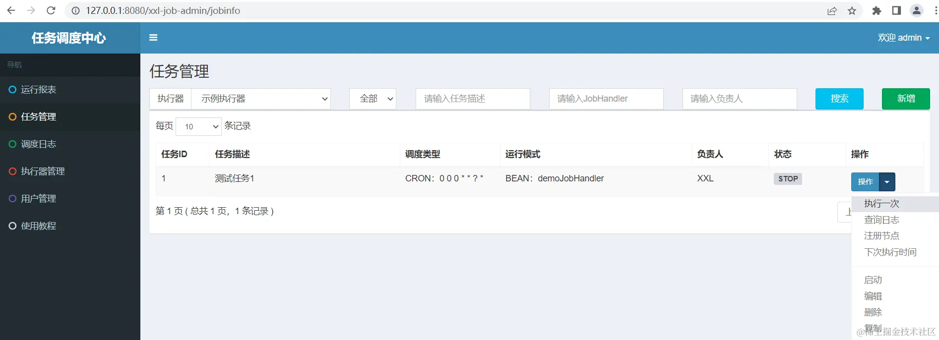 小南本地调试启动管理界面地址:http://127.0.0.1:8080/xxl-job-admin/jobinfo