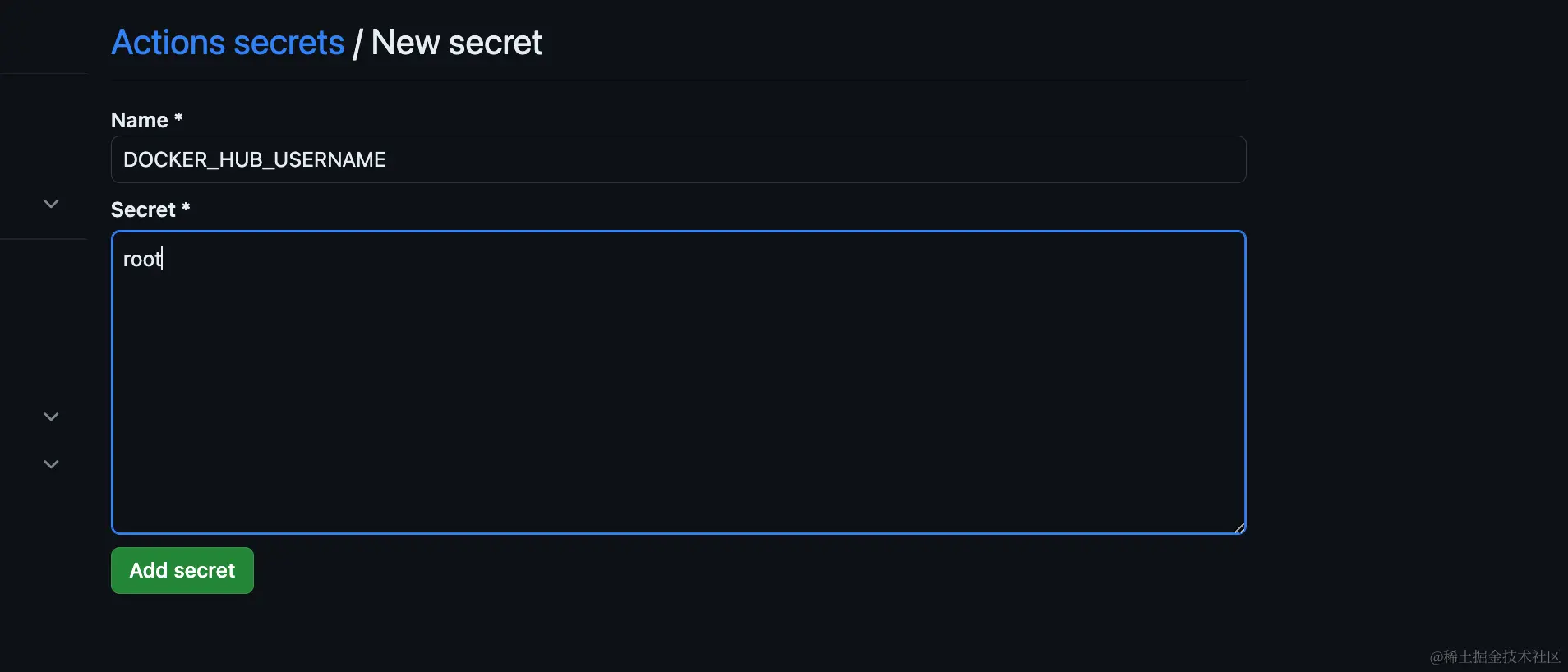 例如,我要创建DOCKER_HUB_USERNAME变量,值为root,配置如下: