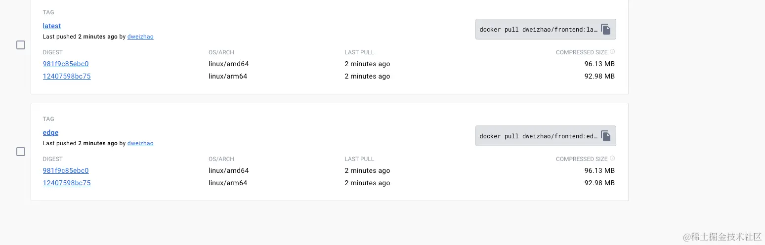 可以镜像仓库在同一时间,构建了latest和1.0.0tag镜像