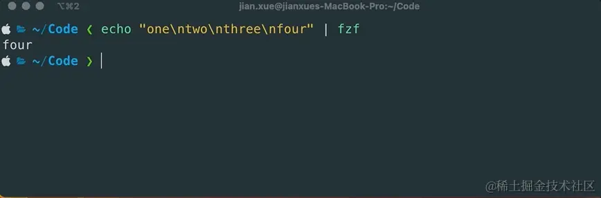 支持通过 CTRL+P/N 上下选择,确认搜索结果后,输入 Enter 确认后,它会将输出直接作为输出打印到标准输出。