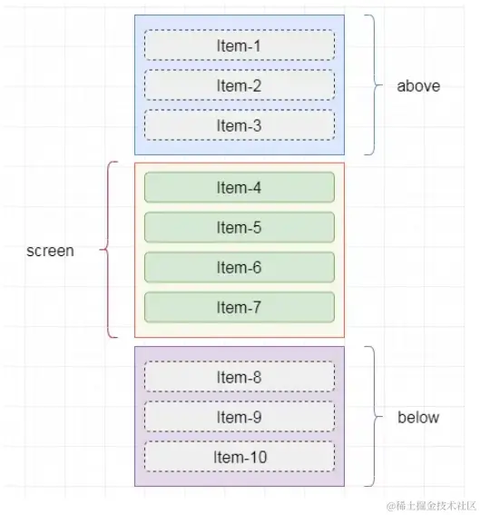 为了避免滚动过快的时候会出现短暂的白屏的现象的出现,可以在可见区域的上方和下方渲染额外的项目,在滚动时给予一些缓冲,所以将屏幕分为三个区域: