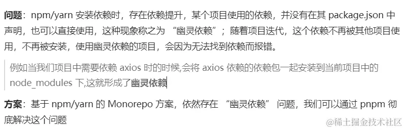 方案:基于 npm/yarn 的 Monorepo 方案,依然存在 “幽灵依赖” 问题,我们可以通过 pnpm 彻底解决这个问题