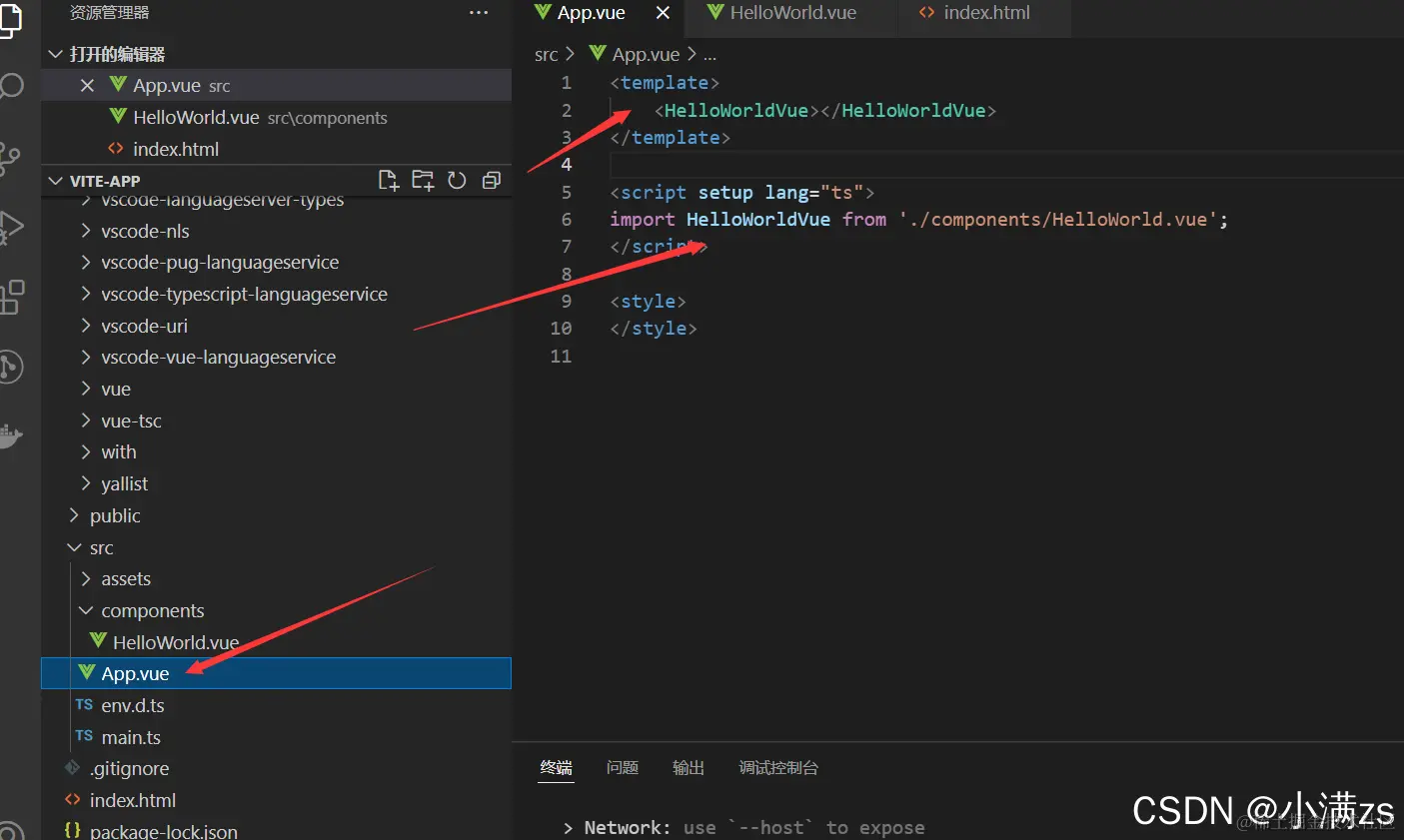 引入子组件 helloWorld 然后直接就可以去当标签去使用 (切记组件名称不能与html元素标签名称一样)