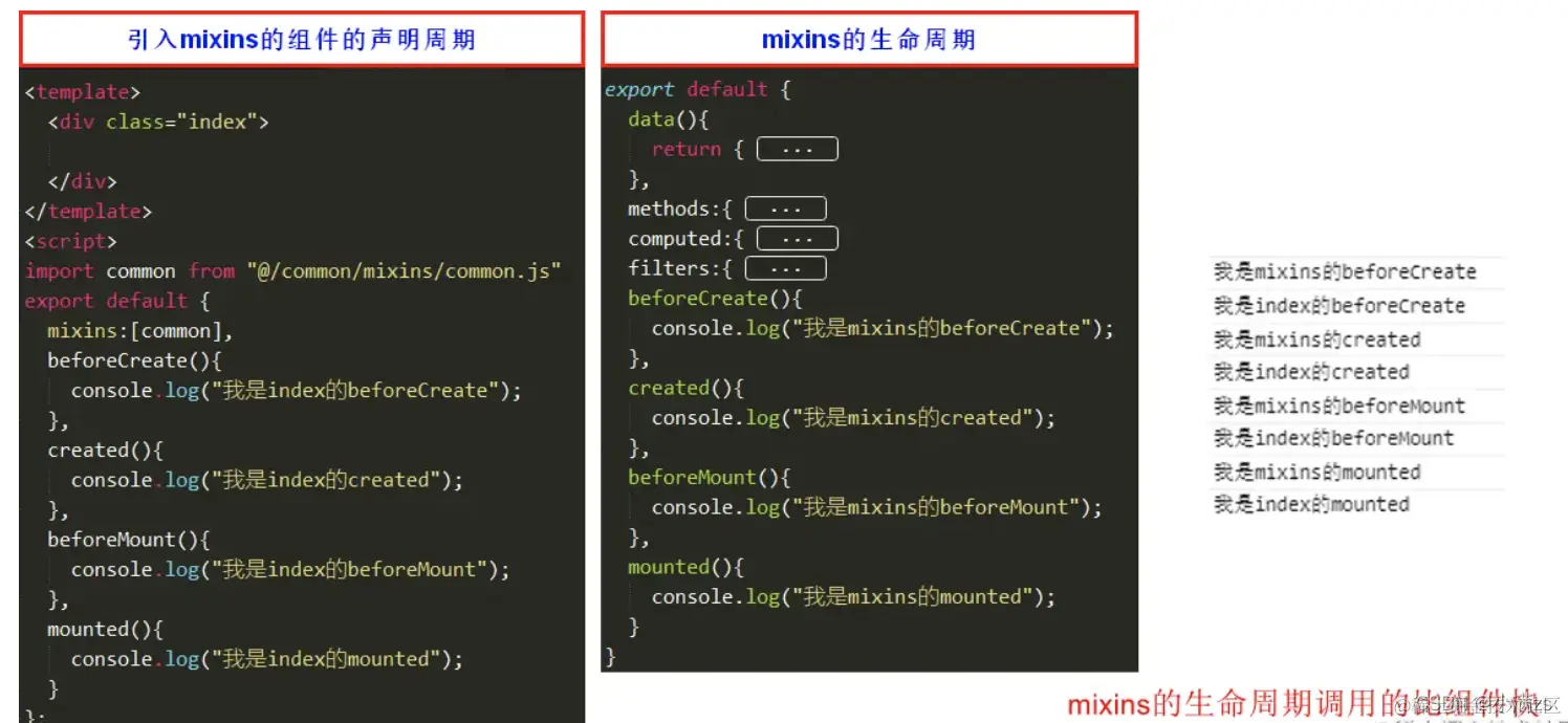 组件的data、methods、filters会覆盖mixins里的同名data、methods、filters。