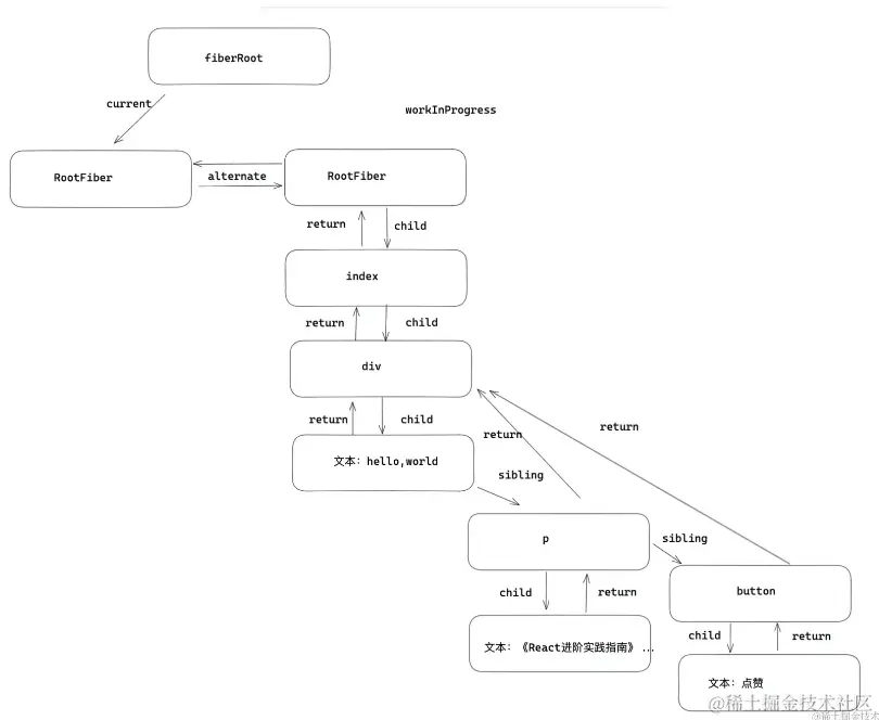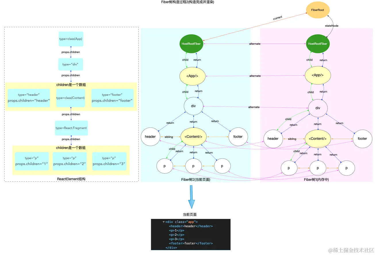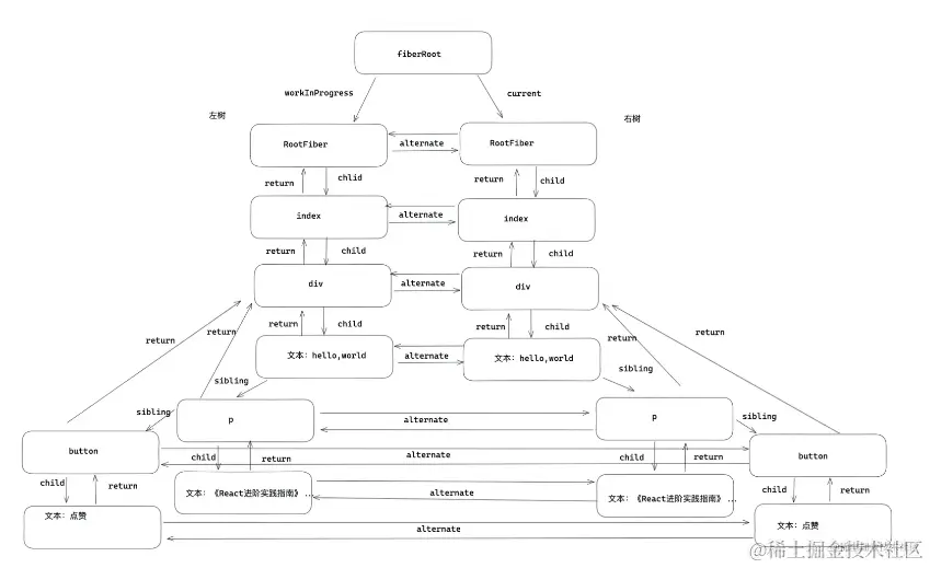 - 输出:再调用渲染器(如react-dom, react-native等)将 fiber 树形结构最终反映到界面上