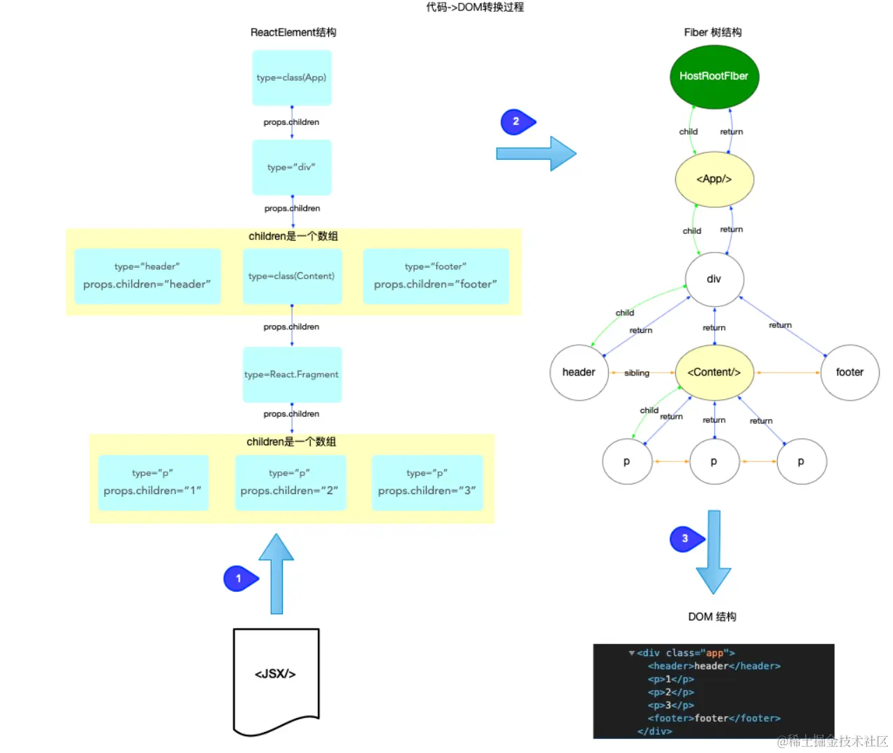 - 调用函数组件、class组件的render方法,将返回的JSX转化为虚拟DOM