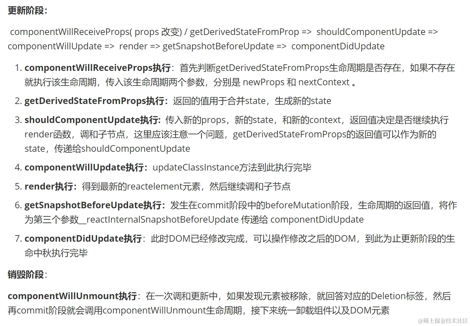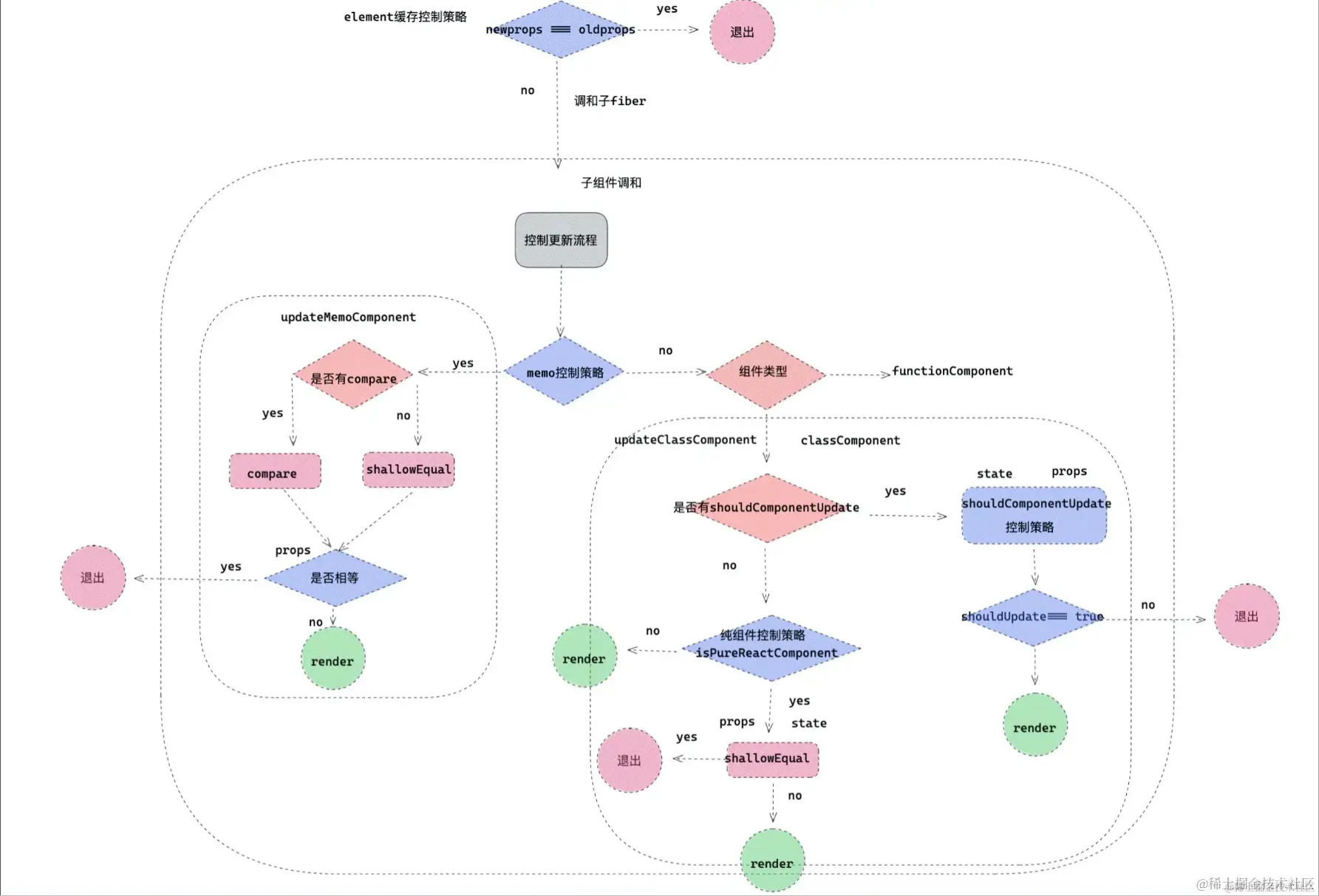 - forceUpdate。类组件更新如果调用的是 forceUpdate 而不是 setState ,会跳过 PureComponent 的浅比较和 shouldComponentUpdate 自定义比较。其原理是组件中调用 forceUpdate 时候,全局会开启一个 hasForceUpdate 的开关。当组件更新的时候,检查这个开关是否打开,如果打开,就直接跳过 shouldUpdate 。