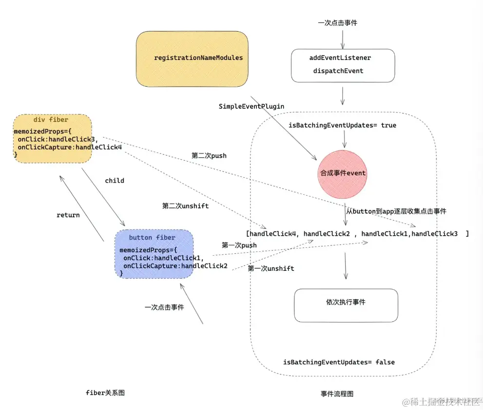 在 React 事件执行之前会调用batchUpdate方法设置 isBatchingEventUpdates=true 打开开关,开启事件批量更新,当该事件结束,再通过 isBatchingEventUpdates = false; 关闭开关,然后在 scheduleUpdateOnFiber 中根据这个开关来确定是否进行批量更新