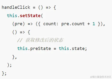 - setState 有专门监听 state 变化的回调函数 callback,可以获取最新state;但是在函数组件中,只能通过 useEffect 来执行 state 变化引起的副作用。