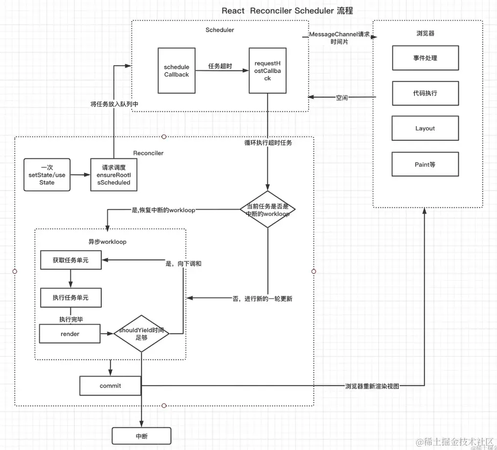 - 执行任务回调:scheduler会控制回调函数执行的时机, 回调函数执行完成后得到全新的 fiber 树