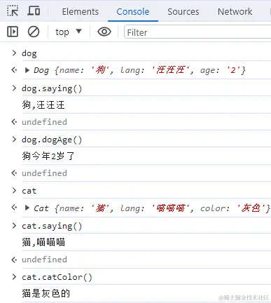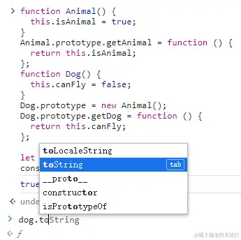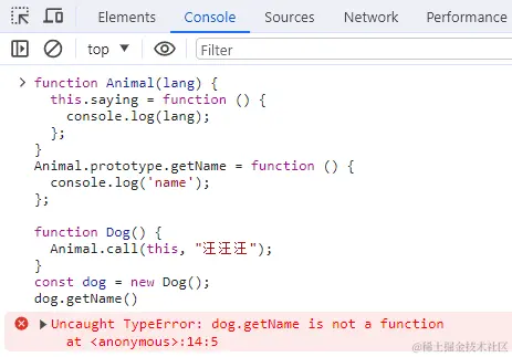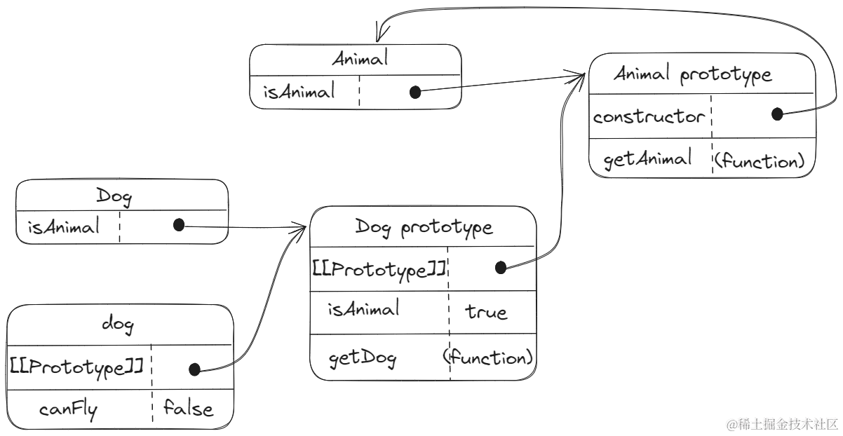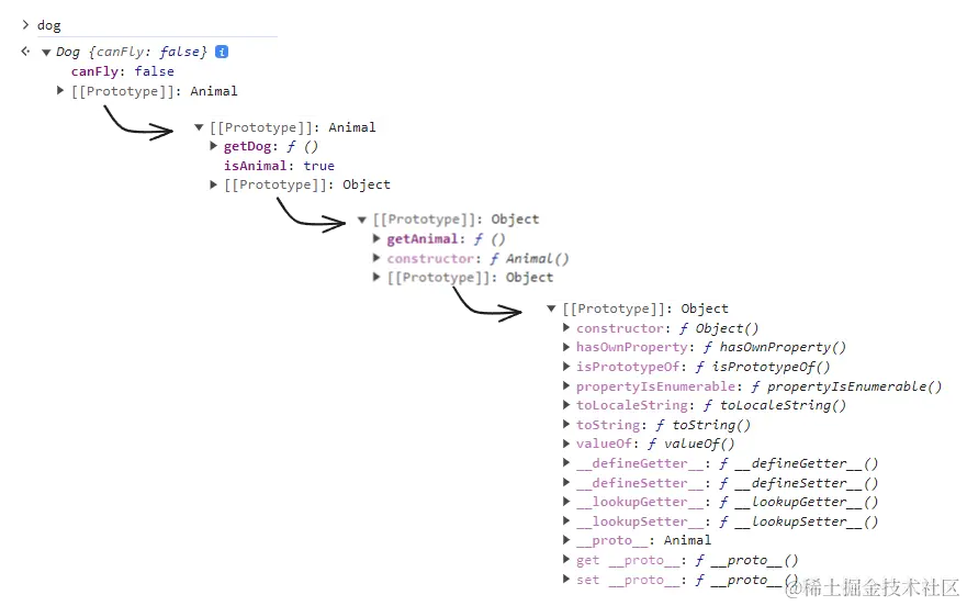 这两个类型的主要区别是,Dog通过创建 Animal的实例并将其赋给自己的原型 Dog.prototype,实现了对Aniaml的继承。这个赋值重写了Dog最初的原型,将其替换为Animal的实例。这表明Animal实例可以访问的所有属性和方法,也会存在于Dog的原型上,因此Dog的实例可以调用getAnimal方法,并返回了属性isAnimal。