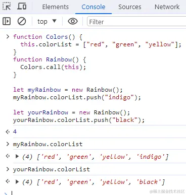 通过使用 call()或apply()方法,Colors构造函数在为 Rainbow 的实例创建的新对象的上下文中执行了。这相当于新的 Rainbow 对象上运行了Colors函数中的所有初始化代码。结果就是每个实例都会有自己的 colorList属性。
