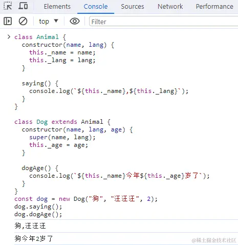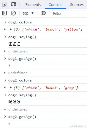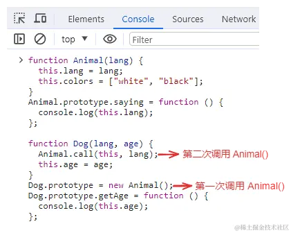 上面代码,Animal构造函数定义了一个lang属性,在它的原型上定义了个saying方法。Dog构造函数调用了Animal构造函数,传入lang属性,定义了自己的属性age,Dog.prototype被赋值为Animal的实例,又在原型上上添加了新方法getAge。