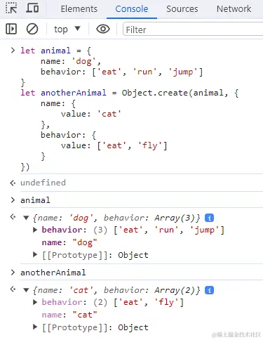 animal对象定义了另一个对象也应该共享的信息,新对象的原型是animal,意味着它的原型上既有原始值属性又有引用值属性。这也意味着animal.behavior不仅是 animal 的属性,也会跟 anotherAnimal 和 yetAnotherAnimal 共享。这里实际上克隆了两个 animal。