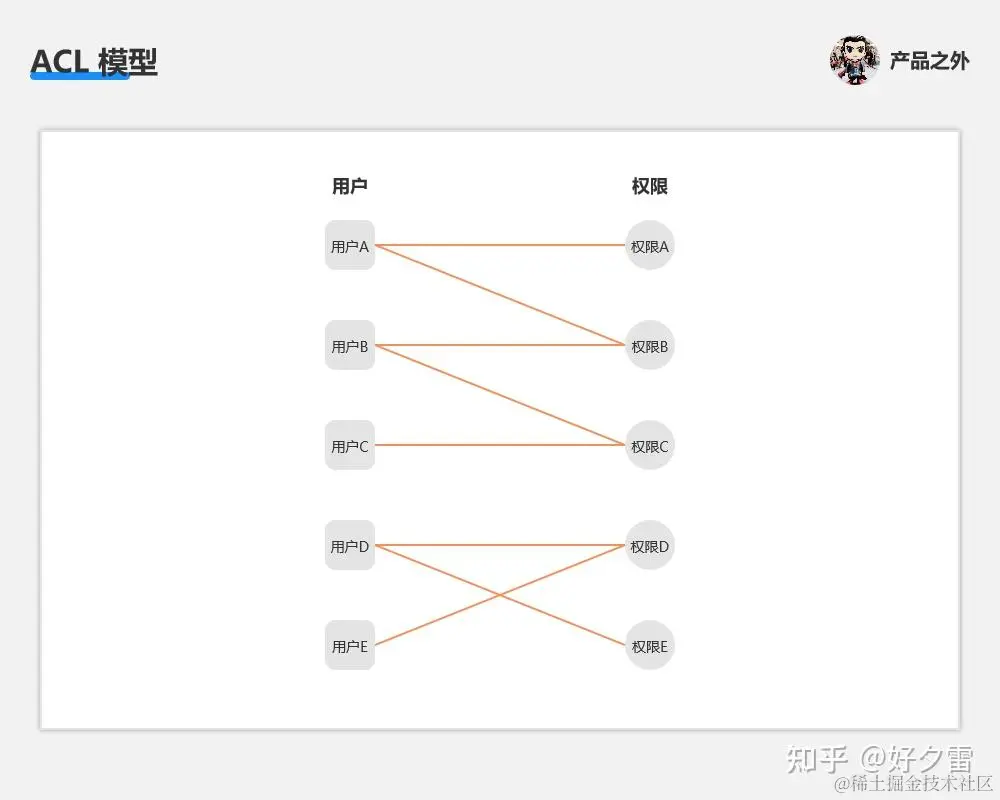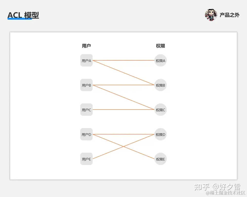 ACL 模型中,涉及了“用户、权限”这两个概念,主要通过用户绑定多个权限,实现了权限控制管理。