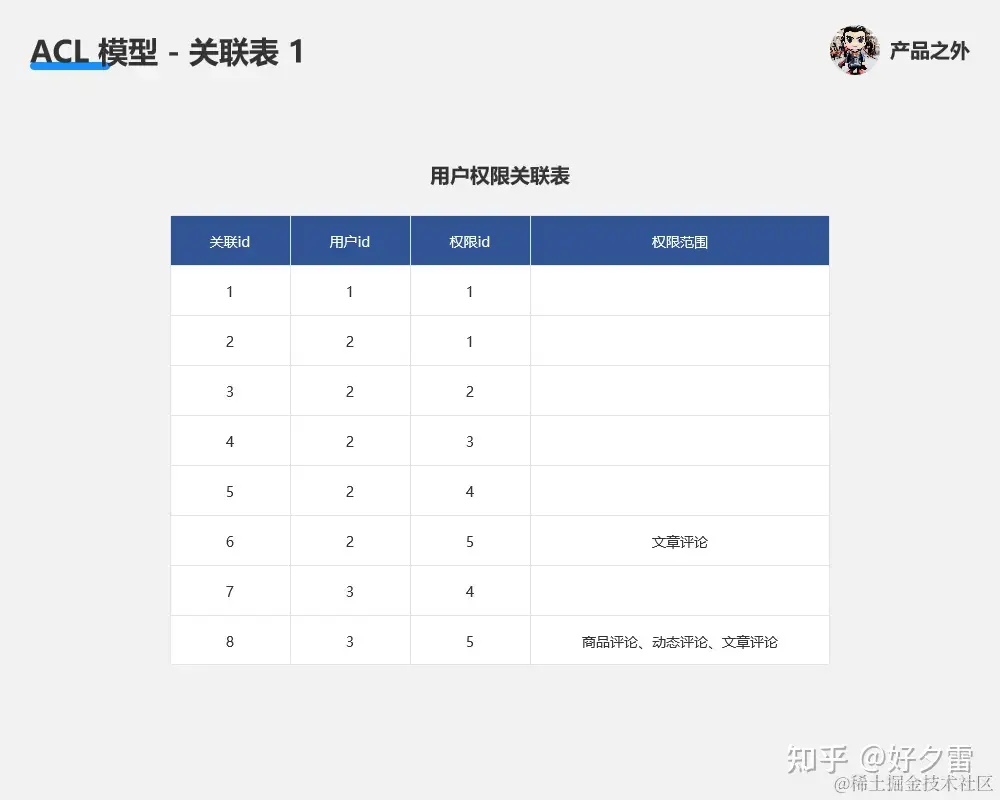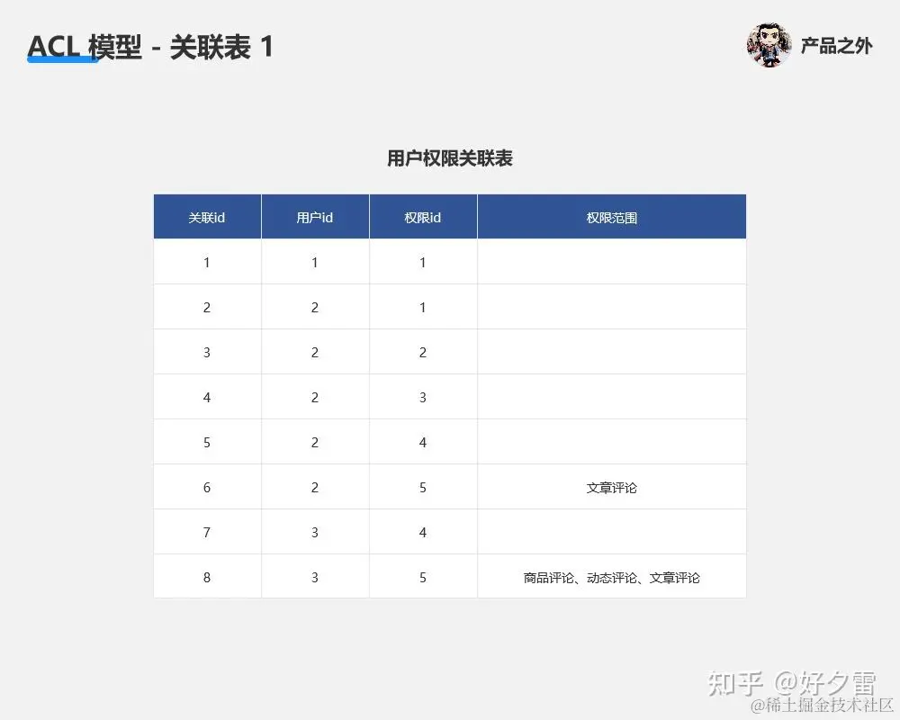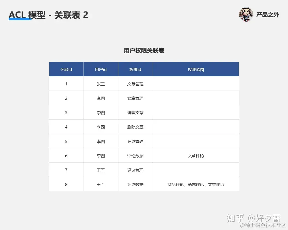我们试着用一些简单的 Excel 表(为了便于理解,简化了部分数据),来理解 ACL 模型、RBAC 模型的权限原理。
