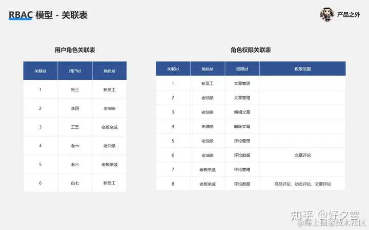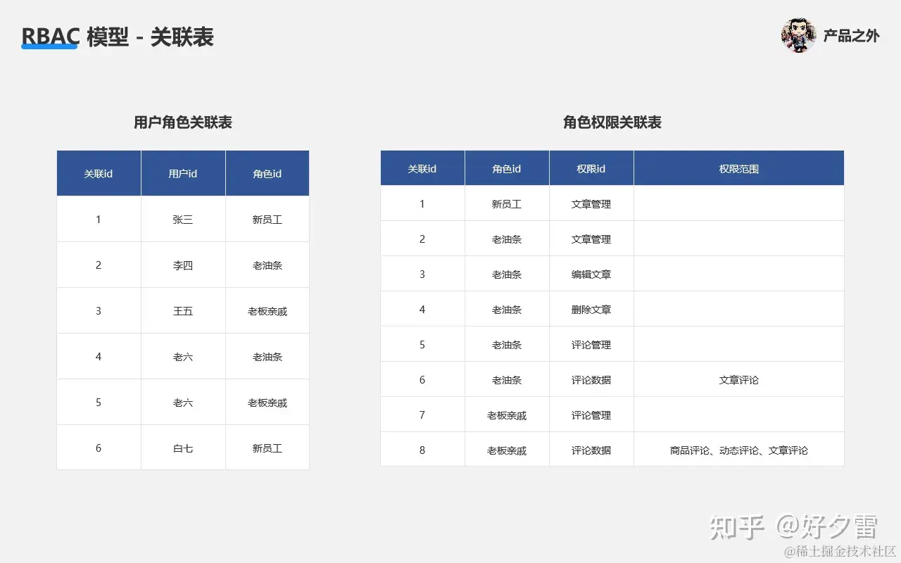我们还需要“用户角色关联、角色权限关联”这两个新表,来实现 RBAC 模型的权限控制。