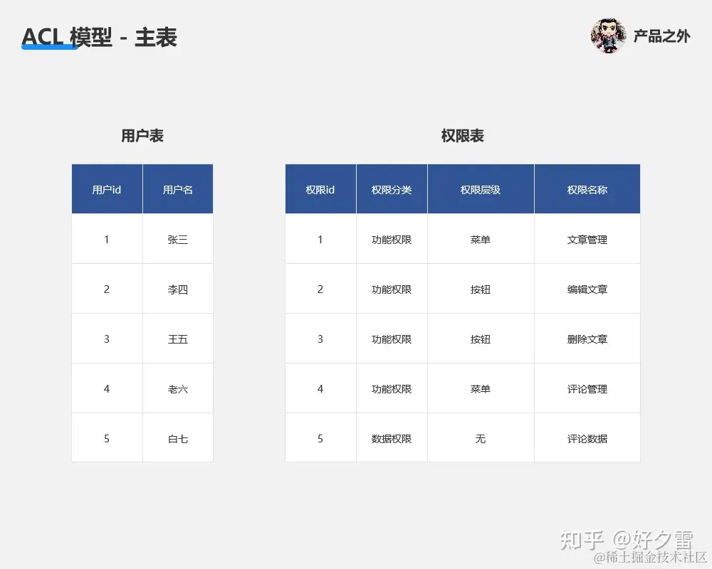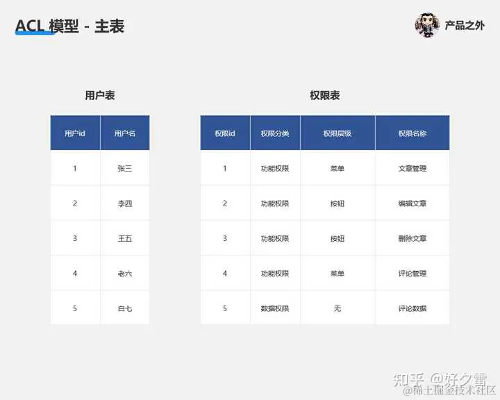 在 ACL 模型中,想实现权限控制,我们首先需要“用户、权限”这两个主表。