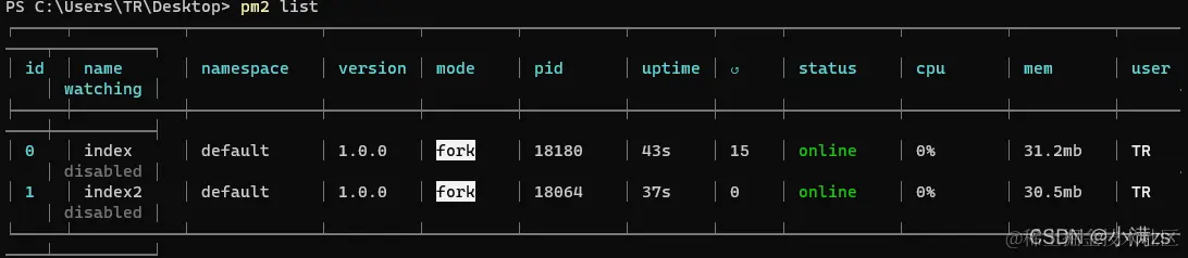 我们可以使用以下命令,查看当前通过 pm2 运行的进程的状态;