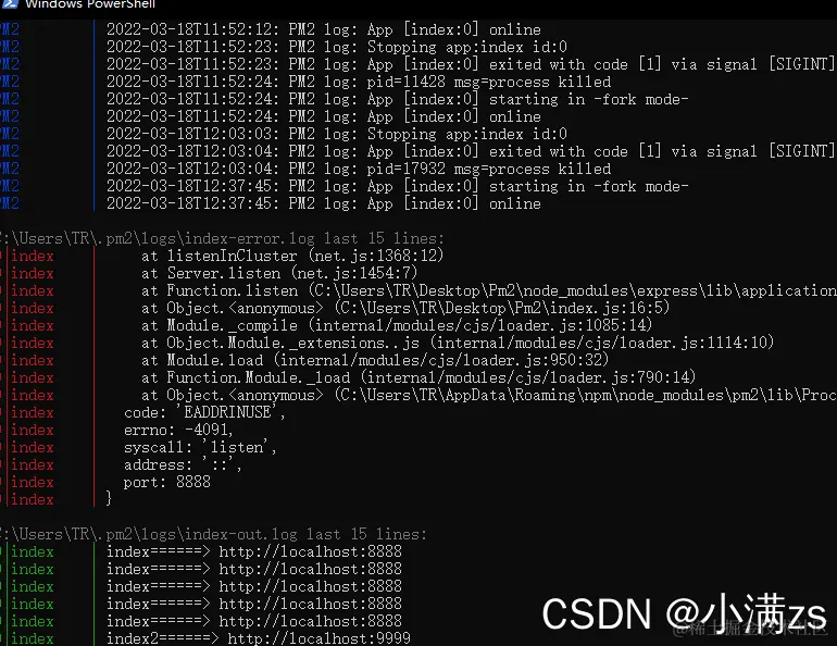 我们可以通过打开日志文件查看日志外,还可以通过 pm2 logs 来查看实时日志,这点有对于线上问题排查;日志查看命令如下: