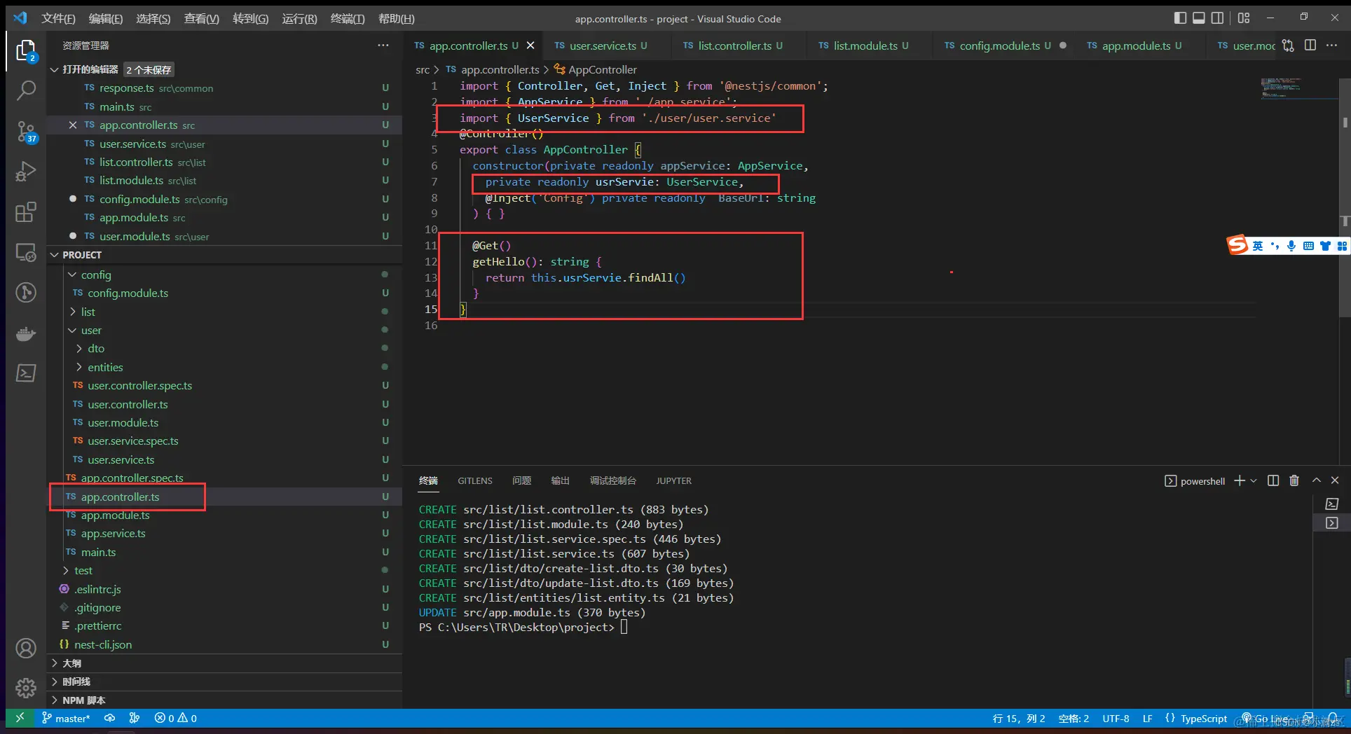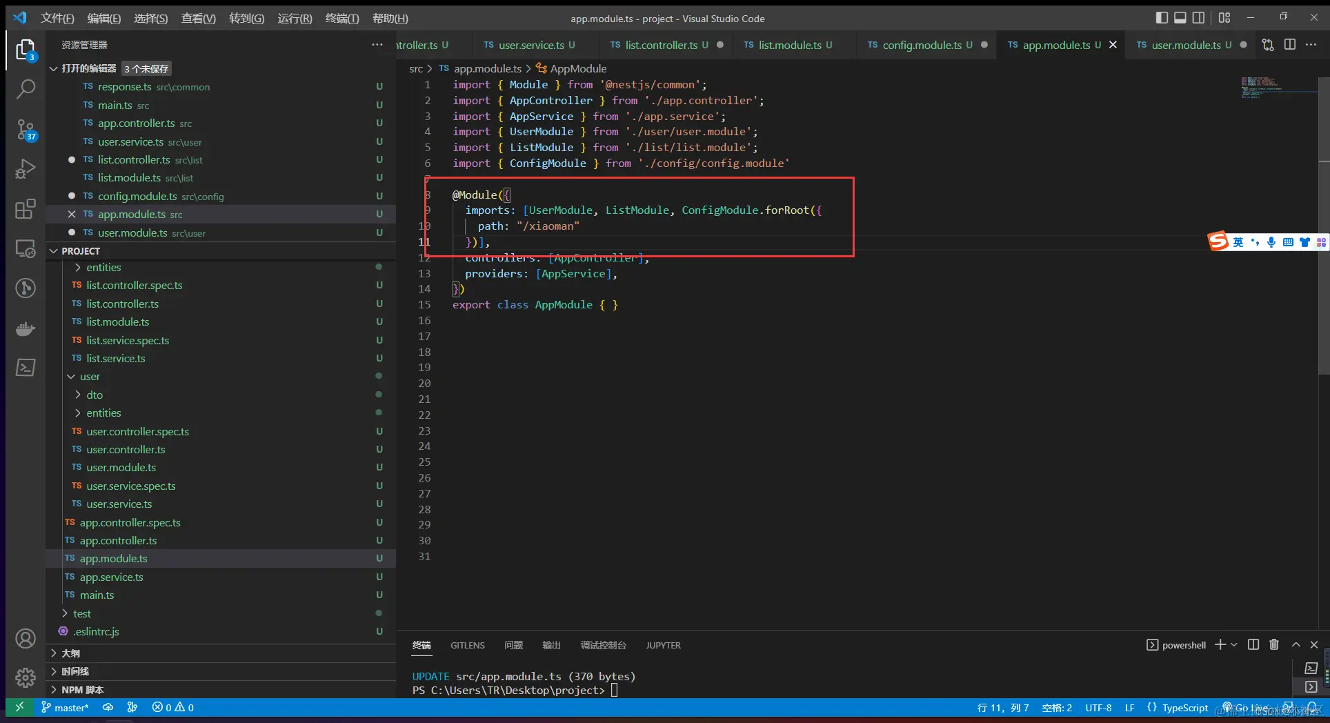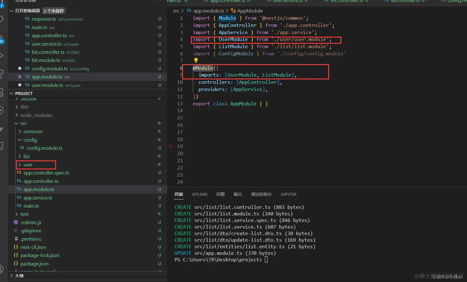当我们使用nest g res user 创建一个CURD 模板的时候 nestjs 会自动帮我们引入模块