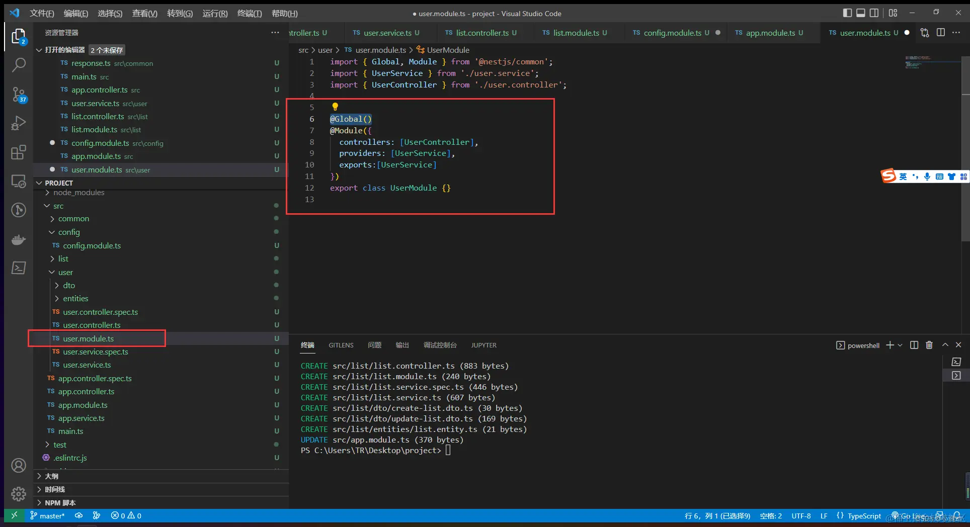 我们给 user 模块添加 @Global() 他便注册为全局模块
