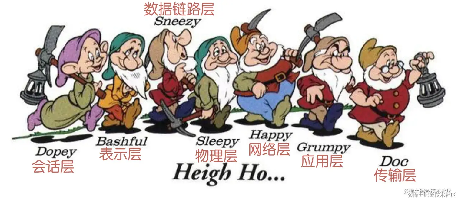 深夜中,在一家美国酒吧坐着几个正在谈论迪斯尼电影里的7个小矮人,他们把小矮人的名字写在餐巾纸上,有人开玩笑说7对于网络分层是个好数字,这几个人就是制定OSI标准小组的成员,后来OSI真的就设计成了七层模型,不过给七层模型重新起了听上去更科学的名字,就这样诞生了。