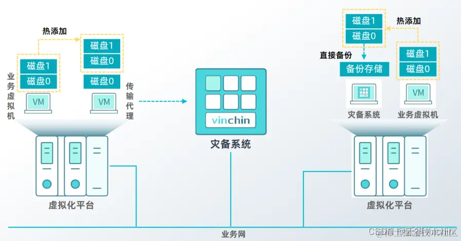 从上图我们可以看出,第一种热添加的方式为:当灾备系统处于虚拟化平台之外的时候,需要在备份目标虚拟机的虚拟化平台上安装一个传输代理,将备份目标虚拟机的磁盘,热添加到传输代理上,再由传输代理将虚拟机备份传输至灾备系统;第二种热添加方式为:灾备系统就是安装部署在虚拟化平台之上的,备份目标的虚拟机磁盘可以直接热添加到灾备系统中,实现数据的直接方案,来进行备份。