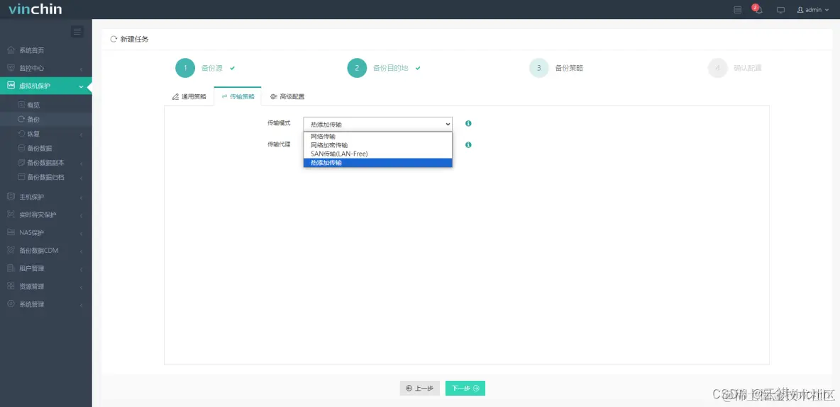 容灾备份系统同样支持采用热添加的方式来备份虚拟机,热添加传输的方式,只是云祺其中一种备份数据的传输方式,除了此种方式,云祺在虚拟机的备份上还支持:LAN、LAN-Free、加密等多种多样的传输方式,可以适应不同的生产环境中,用于提高备份稳定性和效率的方法