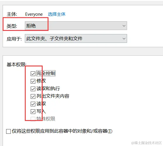 将类型改为“拒绝”,基本权限全部选择,然后逐步确定关闭窗口。