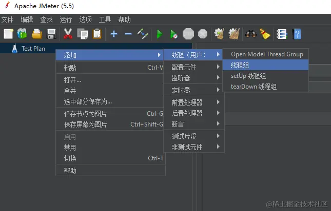 在左侧 Test Plan 鼠标右键 - 添加 - 线程(用户) - 线程组,然后自己设置名称、线程数、时间这些