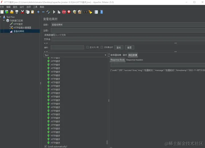 点击顶部菜单那个绿色的三角形图标,启动请求,然后就可以在“查看结果树”那实时看到请求结果了。