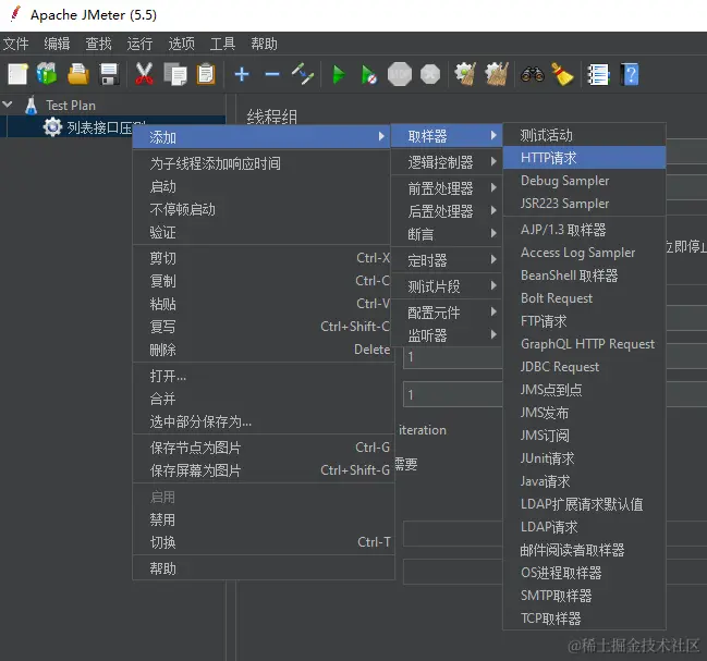 在上面添加的线程组上右键 - 添加 - 取样器 - HTTP请求