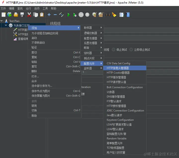 在上面添加的线程组上右键 - 添加 - 配置元件 - HTTP信息头管理器,一般用来设置 Content-Type 或者 token