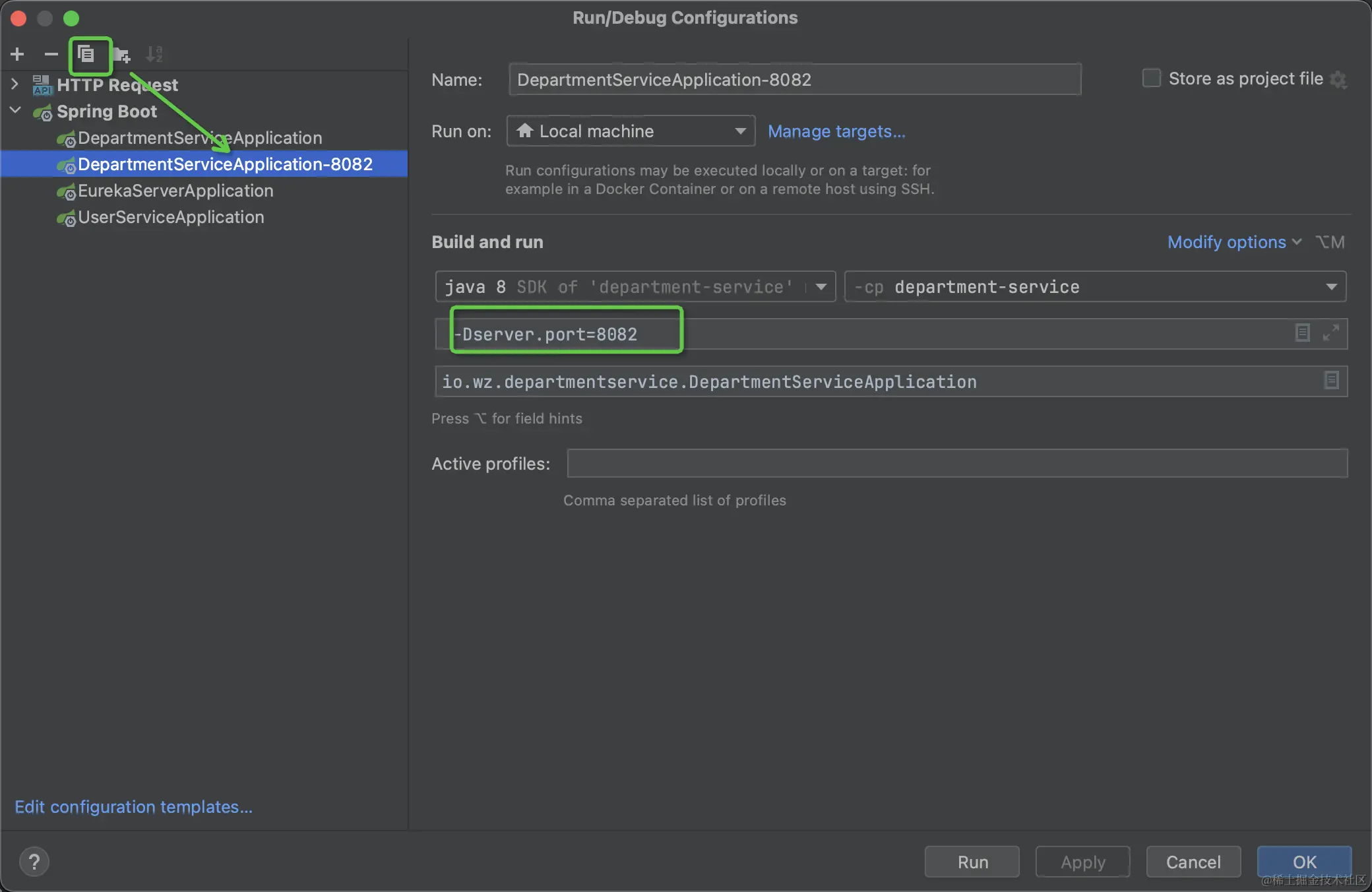 在idea中复制DepartmentServiceApplication配置,同时在启动参数指定应用端口 -Dserver.port=8082